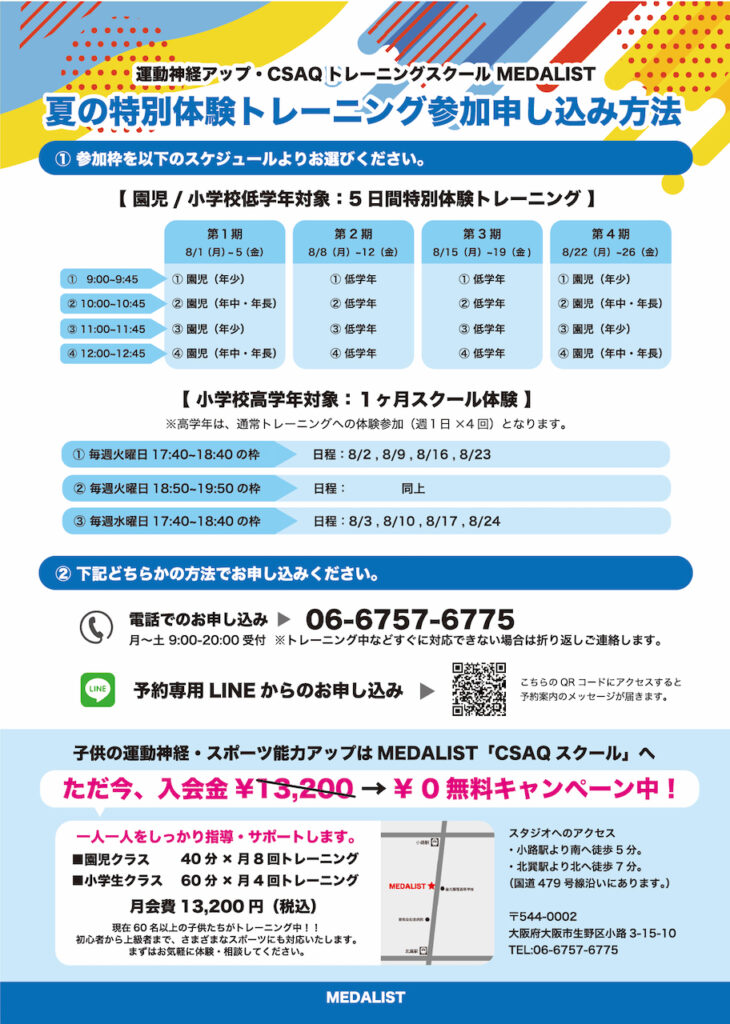 参加費無料!「夏の特別体験トレーニング」を開催します。 2022年7月11日 運動神経向上や、CSAQトレーニングに興味のある子供たちのために、今年も「夏の特別体験トレーニング」を開催します! メダリストが自信を持ってオススメするCSAQトレーニングをガッツリ最大5日間も体験できます。 参加費は無料! 「運動神経を良くしたい、スポーツでもっと活躍したい」子供たちは是非参加してみてください 詳細はチラシ参照・お問い合わせやお申し込みもお気軽にご連絡ください。 URL Copied!