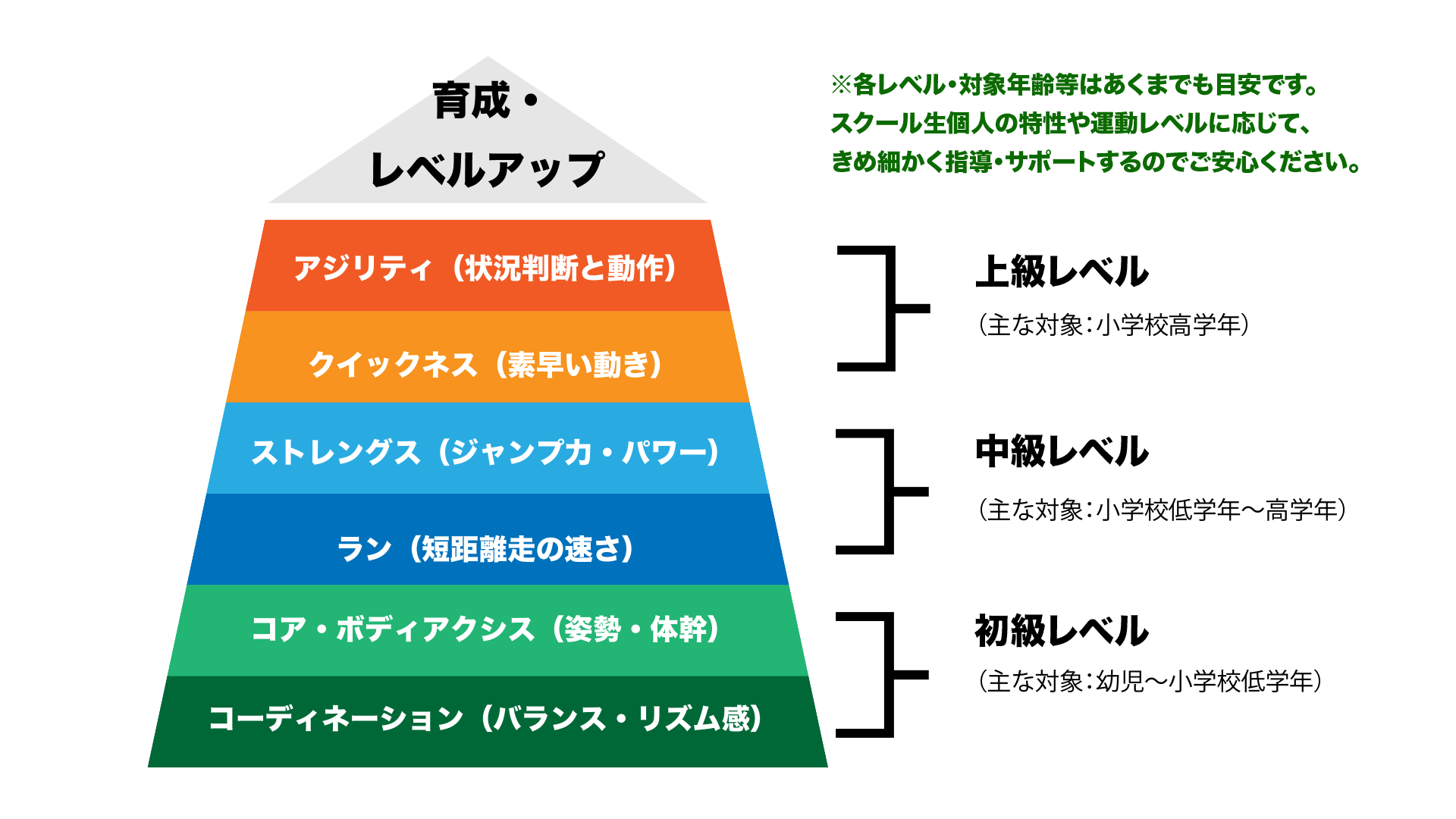 - さまざまなスポーツで思い通りに体を動かしたり、それぞれの競技スキルをより早く高いレベルで習得するために必要な能力を伸ばしていきます。
