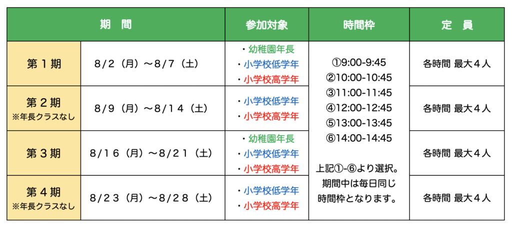 トレーニングスタジオがひとつしかないため、各時間枠は幼稚園年長クラス・低学年クラス・高学年クラスのいずれかのみの開催となります。全て申し込み先着順での対応となりますのでご了承ください。